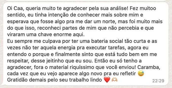 Por outro lado, uma análise individual oferece uma experiência mais profunda e personalizada. Você receberá cerca de 1h30 de áudios gravados detalhando os aspectos específicos do seu Desenho Humano, juntamente com insights e orientações personalizadas. Após a análise, você terá a oportunidade de esclarecer quaisquer dúvidas em uma sessão de follow-up, garantindo que você tenha total compreensão do seu design e como aplicá-lo em sua vida diária.
